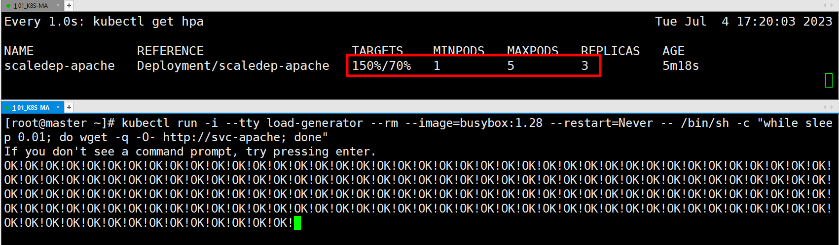 # kubectl run -i --tty load-generator --rm --image=busybox:1.28 --restart=Never -- /bin/sh -c "while sleep 0.01; do wget -q -O- http://svc-apache; done"