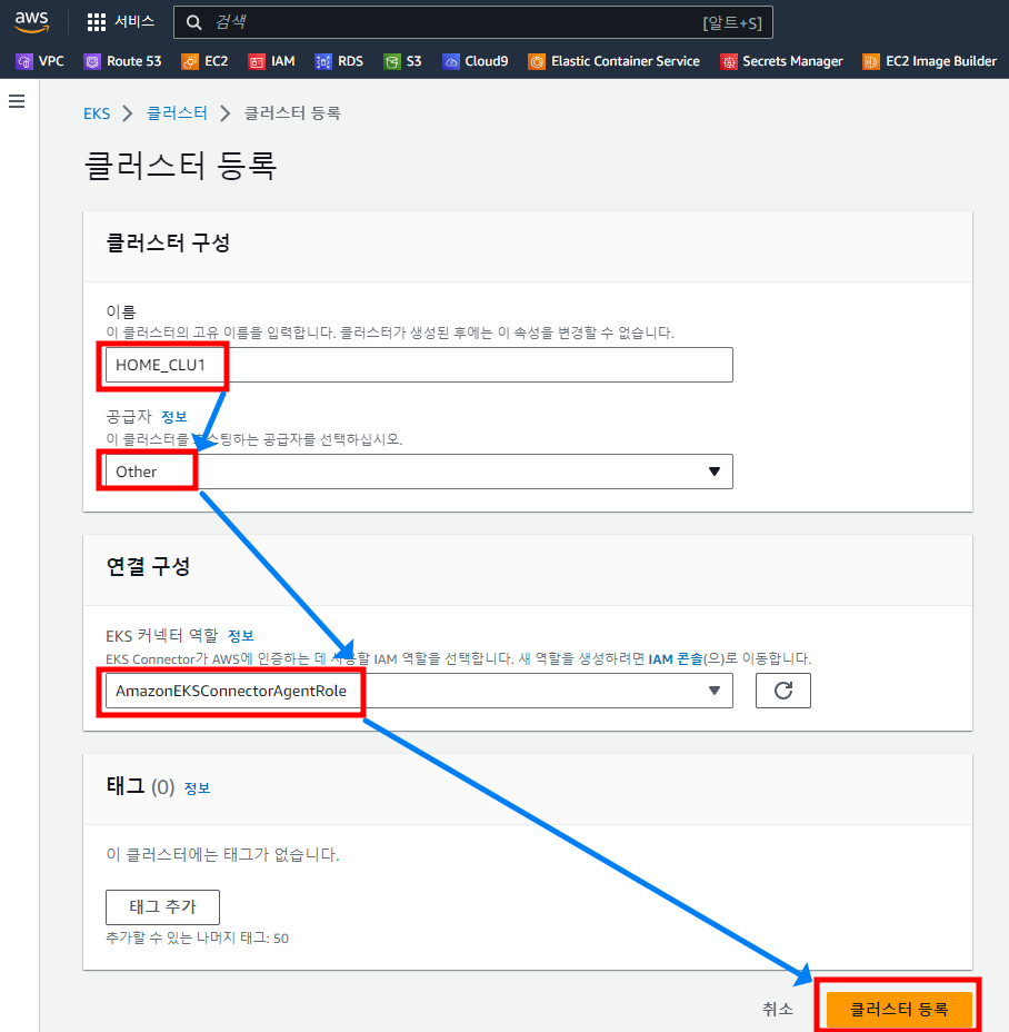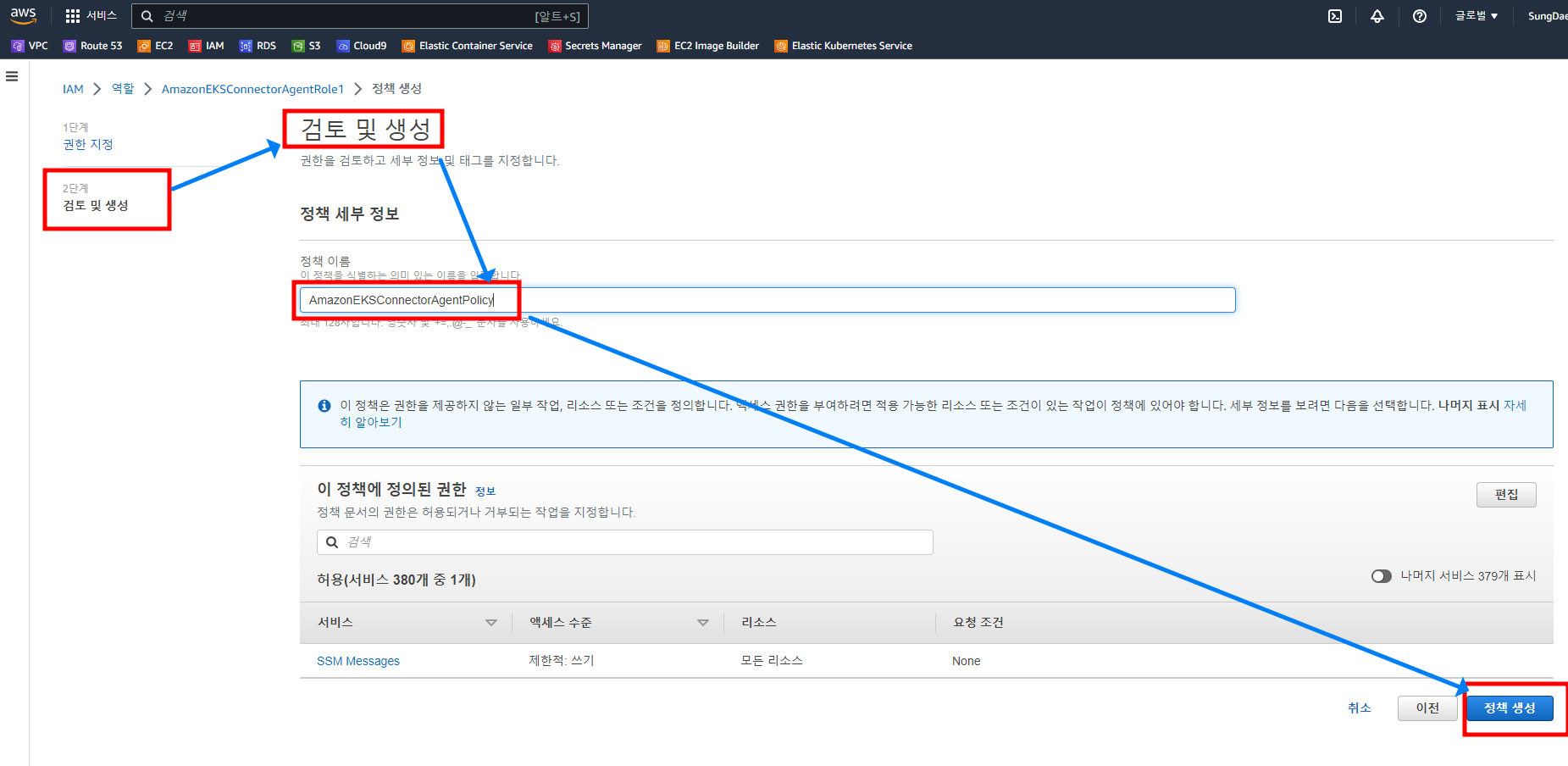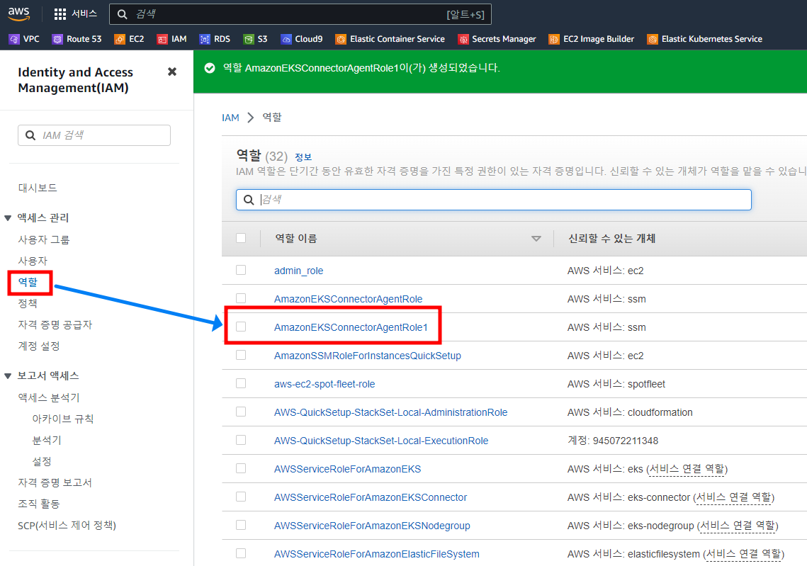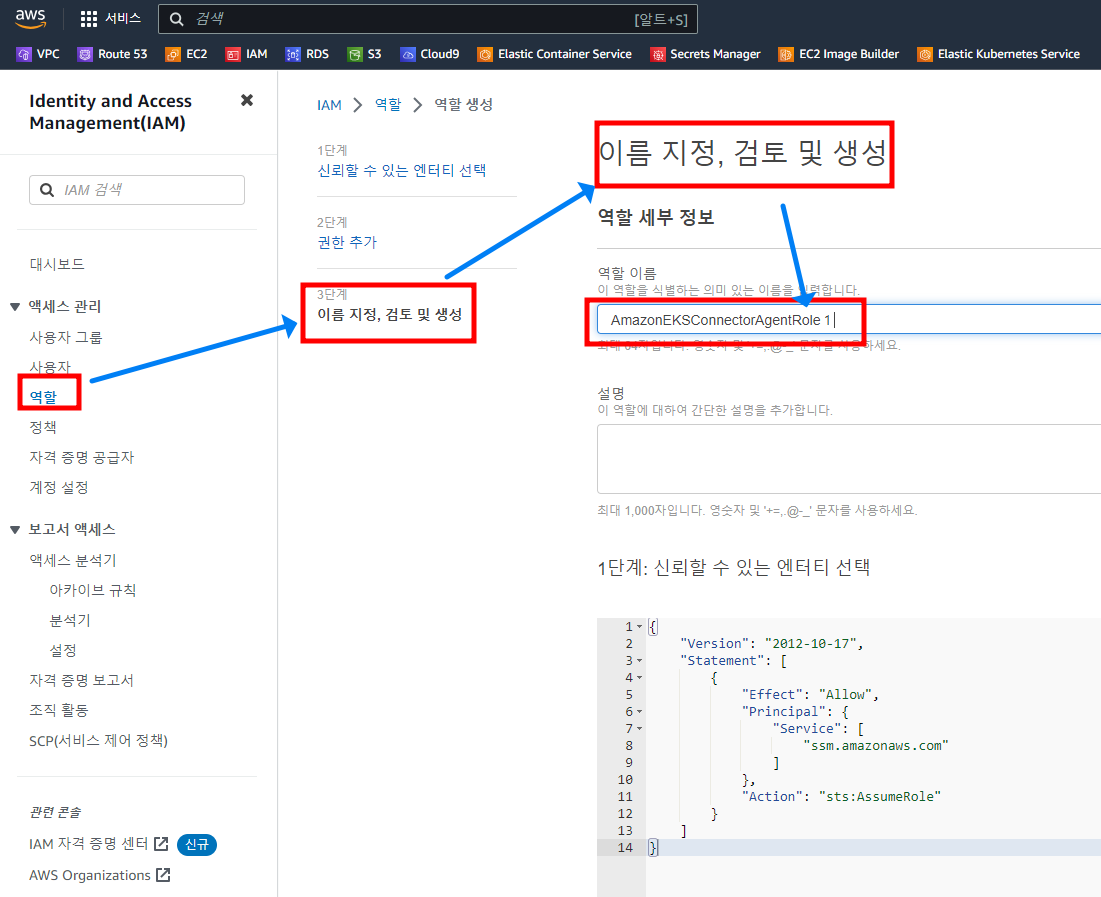 주의: 에제에서는 AmazonEKSConnectorAgentRole1로 생성 했음