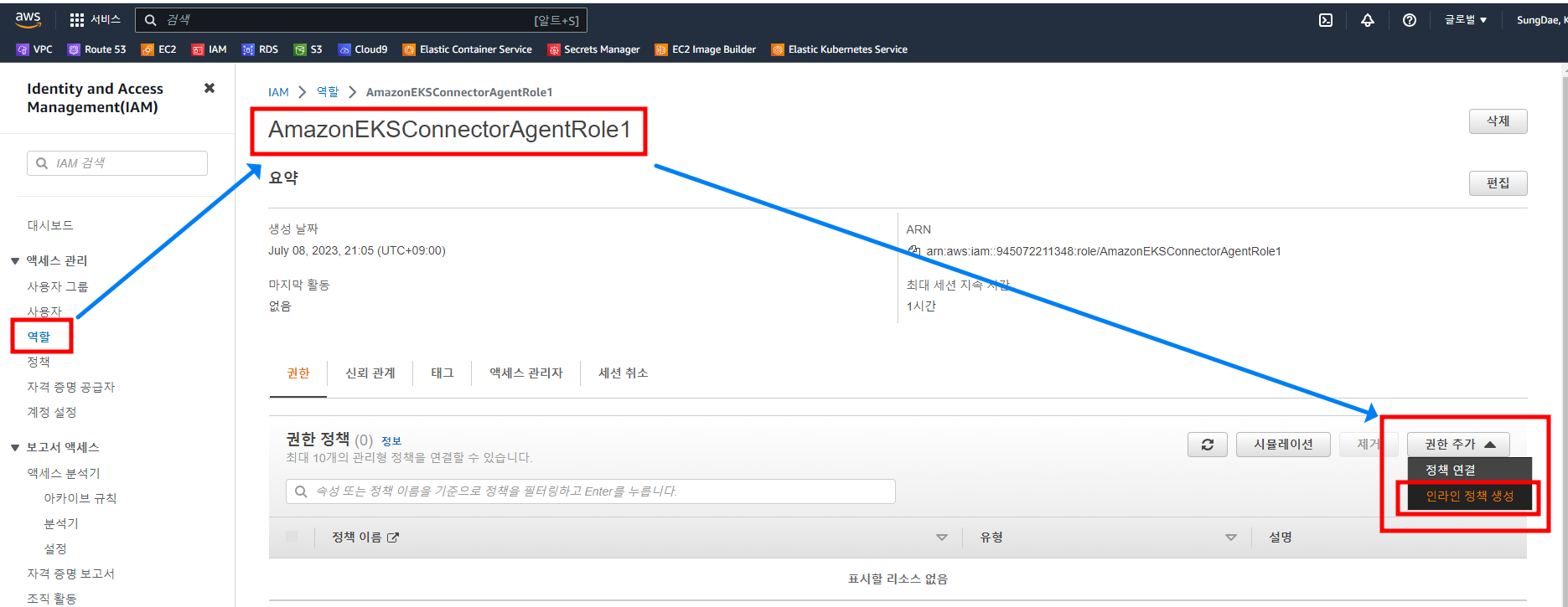 2.1.1. 역할 -> AmazonEKSConnectorAgentRole -> 권한 추가 -> 인라인 정책 설정