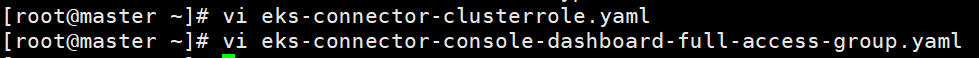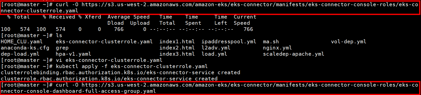 curl -O https://s3.us-west-2.amazonaws.com/amazon-eks/eks-connector/manifests/eks-connector-console-roles/eks-connector-clusterrole.yaml curl -O https://s3.us-west-2.amazonaws.com/amazon-eks/eks-connector/manifests/eks-connector-console-roles/eks-connector-console-dashboard-full-access-group.yaml