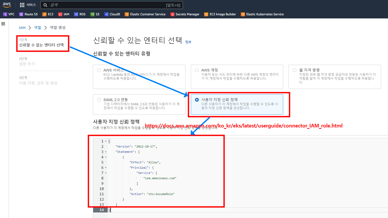 1.1.2. 신뢰할 수 있는 엔터티 선택 -> 사용자 지정 신뢰정책 -> 코드 입력