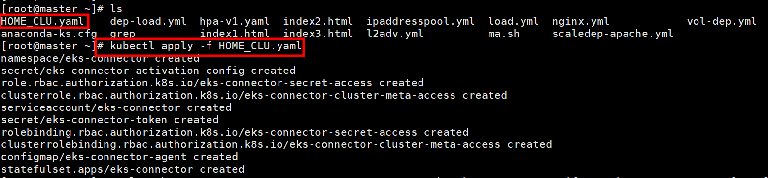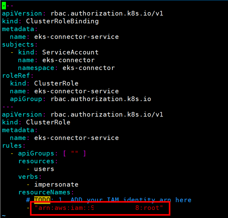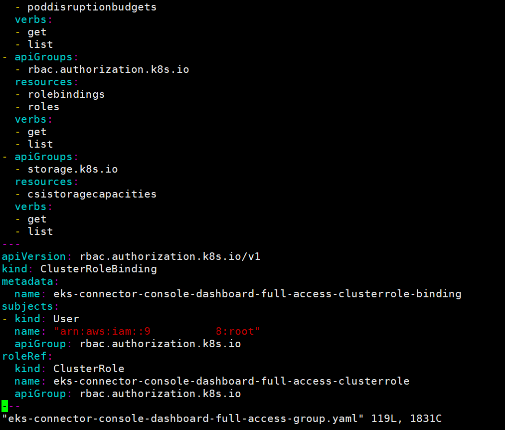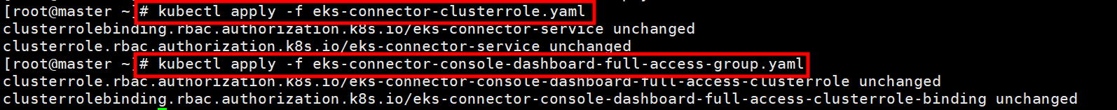kubectl apply -f eks-connector-clusterrole.yaml kubectl apply -f eks-connector-console-dashboard-full-access-group.yaml