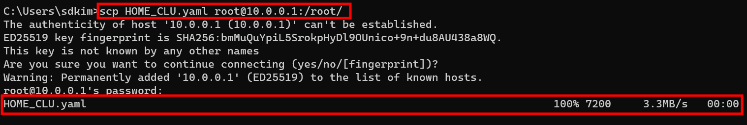 scp HOME_CLU.yaml root@10.0.0.1[마스터노드IP]:/root[경로지정]