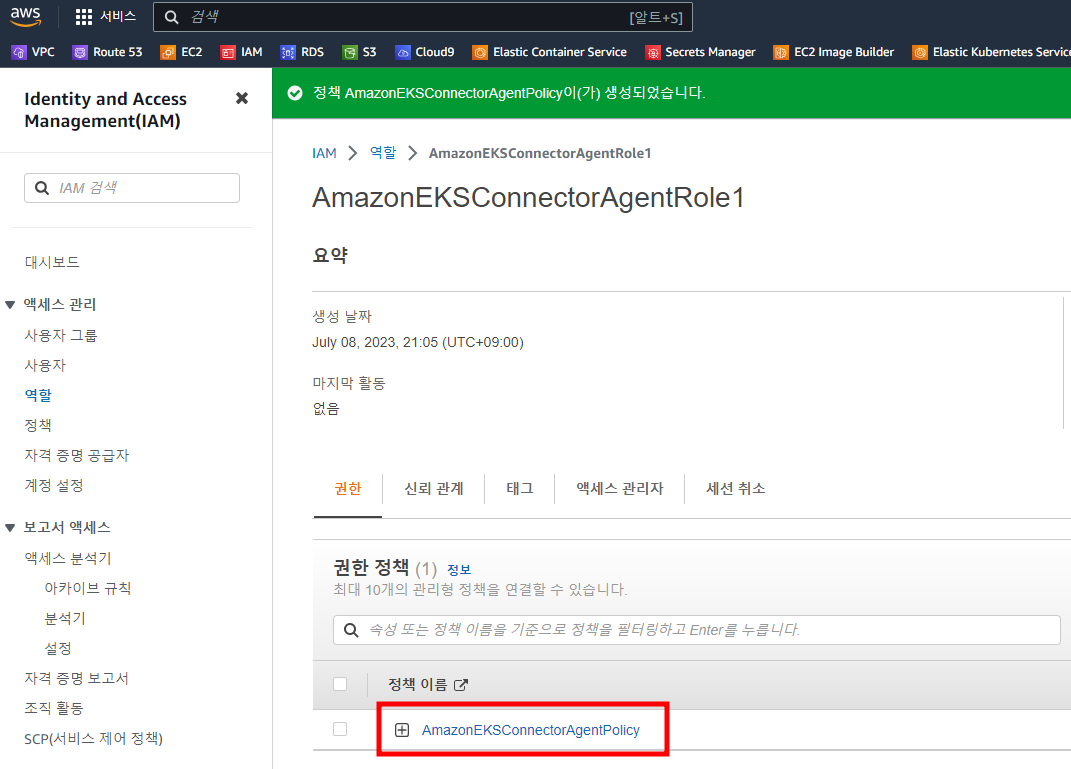 AmazonEKSConnectorAgentPolicy -> 정책 설정 클릭