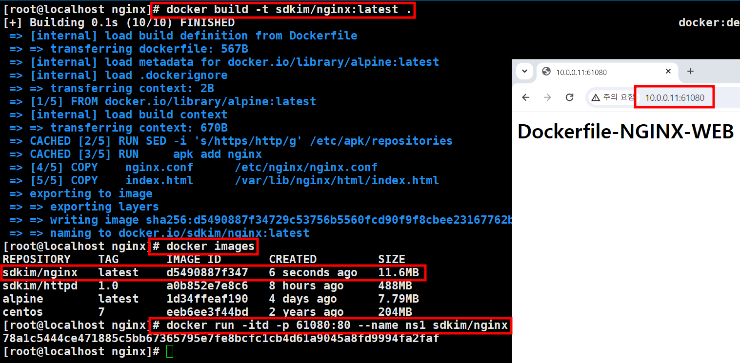 # step1: base image download FROM alpine # step2: /etc/apk/repositories fix RUN sed -i 's/https/http/g' /etc/apk/repositories # step3: nginx packgae add RUN apk add nginx # step4: nginx.conf add COPY nginx.conf /etc/nginx/nginx.conf COPY index.html /var/lib/nginx/html/index.html #ADD https://ko.wordpress.org/wordpress-5.7.8-ko_KR.tar.gz ./ #ADD Test # step5: port 80/tcp EXPOSE 80 # step6: excute #ENTRYPOINT ["nginx"] #CMD ["-g", "daemon off;"] CMD nginx -g 'daemon off;'