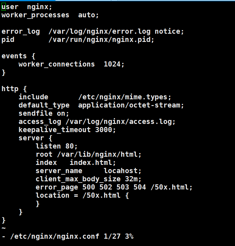 user nginx; worker_processes auto; error_log /var/log/nginx/error.log notice; pid /var/run/nginx/nginx.pid; events { worker_connections 1024; } http { include /etc/nginx/mime.types; default_type application/octet-stream; sendfile on; access_log /var/log/nginx/access.log; keepalive_timeout 3000; server { listen 80; root /var/lib/nginx/html; index index.html; server_name locahost; client_max_body_size 32m; error_page 500 502 503 504 /50x.html; location = /50x.html { } } }