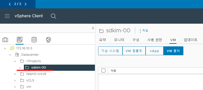 # yum install -y tar wget epel-release python-pip # wget https://files.pythonhosted.org/packages/ae/a4/70716f2fb132b105bc6cb4d4399491364582ab5690c87f19d6a9e4096037/pyvmomi-8.0.2.0.1.tar.gz # tar xvfz pyvmomi-8.0.2.0.1.tar.gz # ls # cd pyvmomi-8.0.2.0.1 # python setup.py install # dnf install ansible-core # ansible-galaxy collection install community.vmware # pip install requests # vi folder.yml --- - hosts: localhost vars: ansible_python_interpreter: /bin/python3 gather_facts: no vcenter_hostname: "172.16.10.3" vcenter_username: "administrator@team0.local" vcenter_password: "VMware1!" datacenter_name: "Datacenter" project_id: "PRT-00" parent_folder: "1.Projects" tasks: - name: 01. Create a Project folder community.vmware.vcenter_folder: hostname: '{{ vcenter_hostname }}' username: '{{ vcenter_username }}' password: '{{ vcenter_password }}' validate_certs: false datacenter_name: '{{ datacenter_name }}' folder_name: '{{ project_id }}' # parent_folder: "4.Projects" parent_folder: '{{ parent_folder }}' state: present register: sub_folder_creation_result delegate_to: localhost :wq # ansible-playbook folder.yml8. requests 모듈이 없음