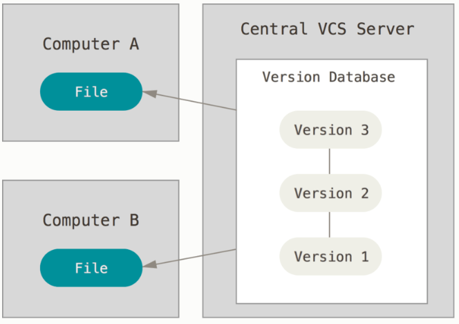 3.2. CVCS3.2.1. 탄생배경: 프로젝트를 진행하다 보면 다른 개발자와 함께 작업해야 하는 경우가 많다. 이럴 때 생기는 문제를 해결 3.2.2. CCVS, Subversion, Perforce 같은 시스템은 파일을 관리하는 서버가 별도로 있고 클라이언트가 중앙 서버에서 파 일을 받아서 사용(Checkout)