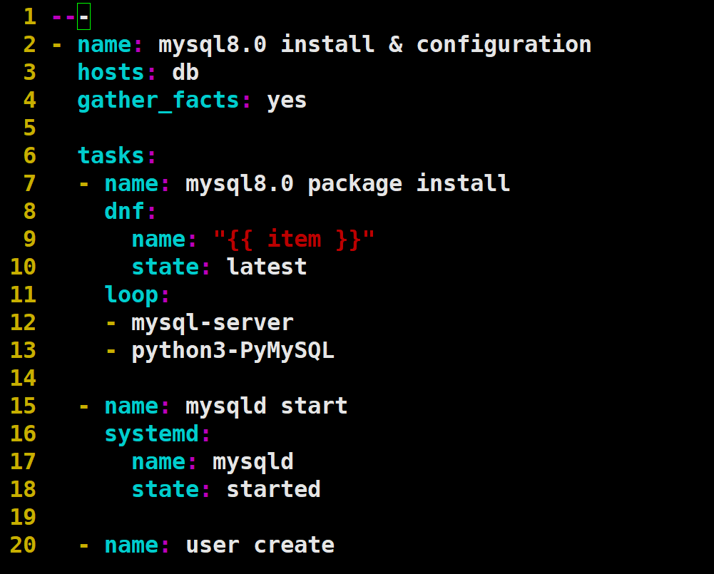 --- - name: mysql8.0 install & configuration hosts: db gather_facts: yes ignore_errors: true tasks: - name: mysql8.0 package install dnf: name: "{{ item }}" state: latest loop: - mysql-server - python3-PyMySQL - name: mysqld start systemd: name: mysqld state: started - name: user create mysql_user: login_user: root name: root password: It12345! priv: '*.*:ALL' host: '%' state: present - name: db create mysql_db: login_user: root name: wordpress state: present - name: firewall tcp/3306 open firewalld: port: 3306/tcp immediate: yes permanent: yes state: enabled728x90'공부합시다! > Ansible' 카테고리의 다른 글
