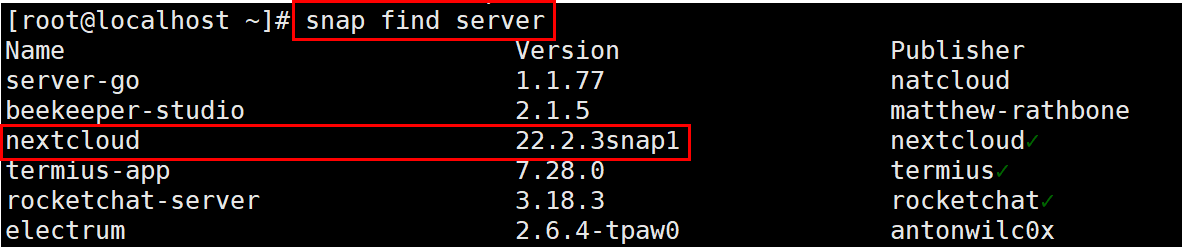 snap 설치 2.3. snap 명령어를 이용한 NextCloud 꾸러미 확인