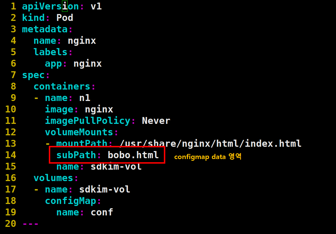 2. subpath에 configmap의 bobo.html 영역 참조