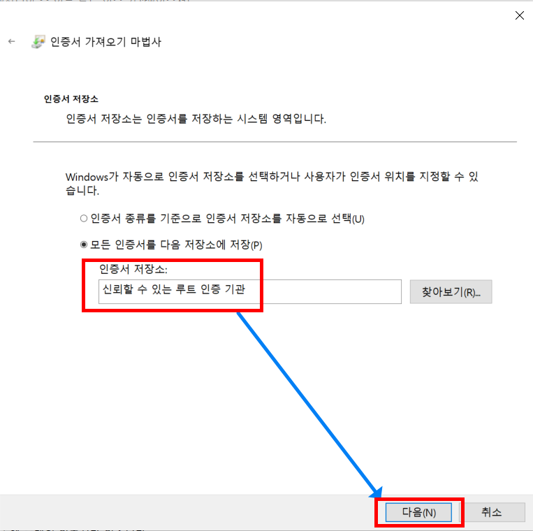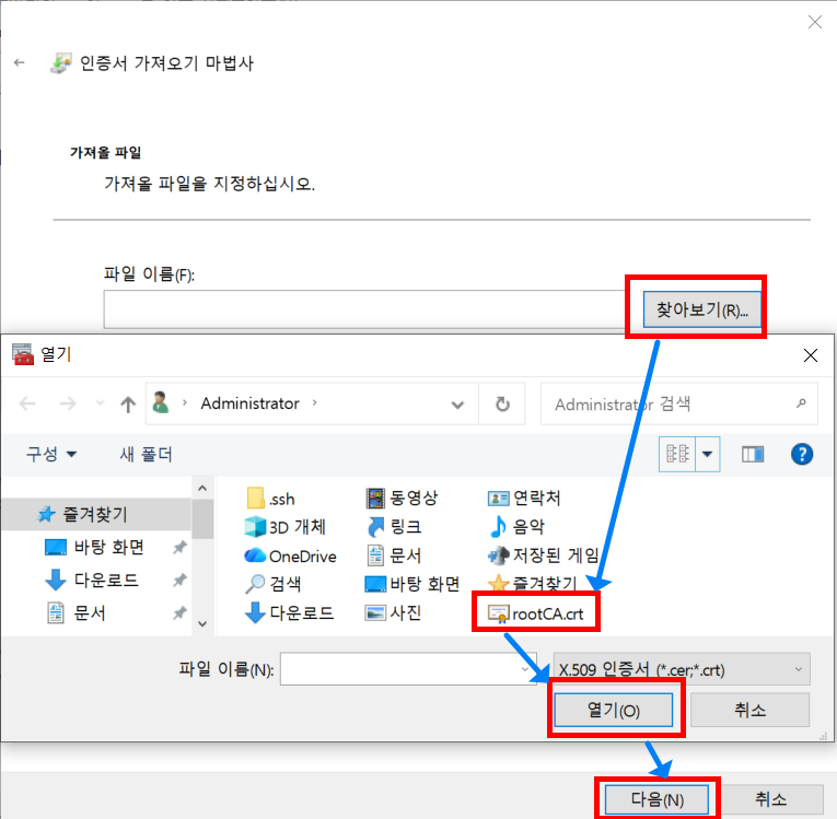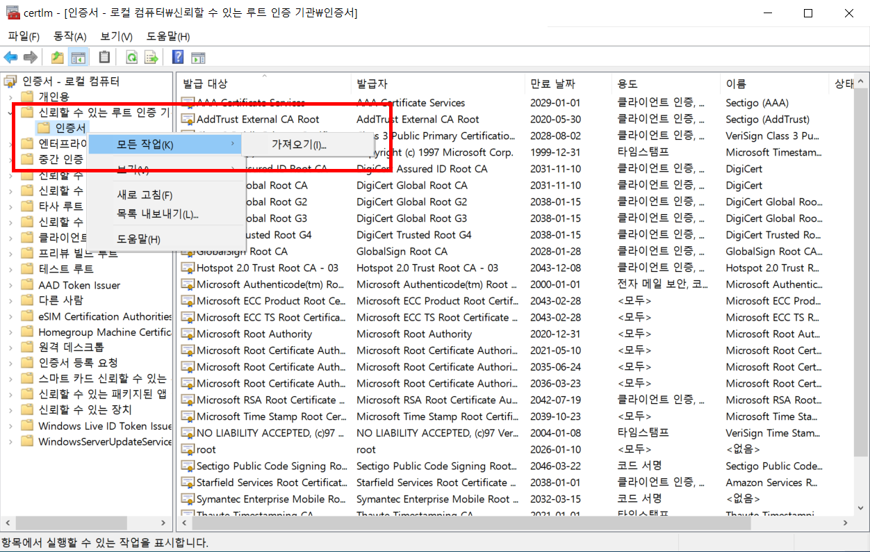 9.2.1. 신뢰할 수 있는 루트 인증 기관 -> 인증서 -> 모든 작업 -> 가져오기