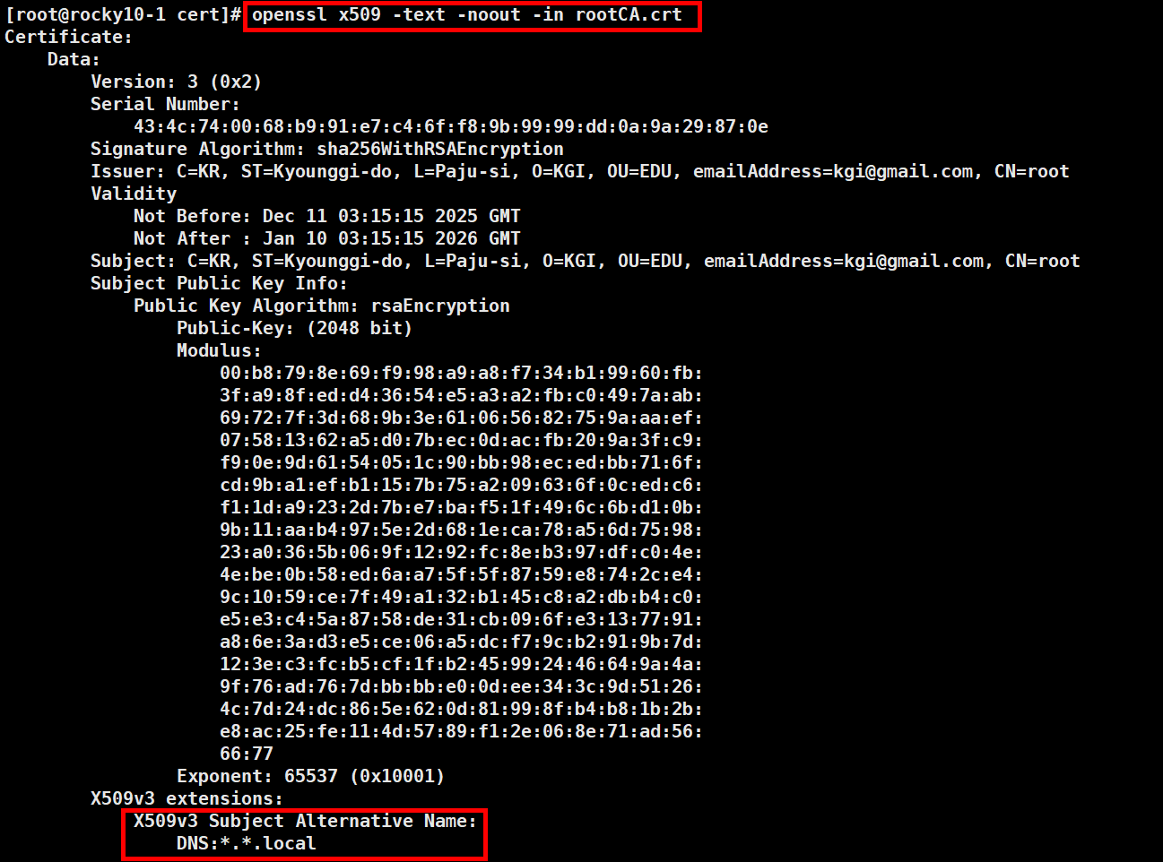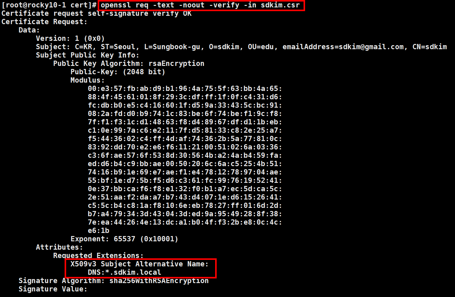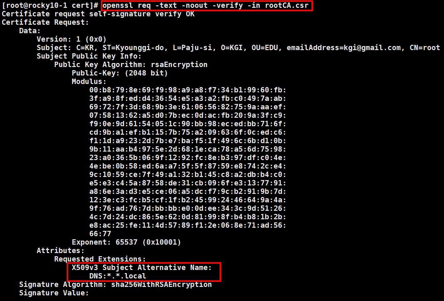 [req] default_bits = 2048 prompt = no default_md = sha256 distinguished_name = dn req_extensions = v3_req [dn] C = KR ST = Kyounggi-do L = Paju-si O = KGI OU = EDU emailAddress = kgi@gmail.com CN = root [v3_req] subjectAltName = @alt_names [alt_names] DNS.1 = *.*.local2.2. sdkim.cnf
