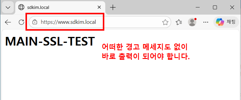 10. 클라이언트 브라우저 접속 테스트: 아무런 경고 메세지가 출력되지 않고 https로 접속이 되어야 합니다.