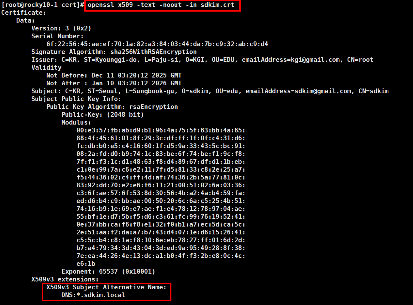 # openssl x509 -req -in rootCA.csr -signkey rootCA.key -out rootCA.crt -extfile root.cnf -extensions v3_req # openssl x509 -req -in sdkim.csr -CA rootCA.crt -CAkey rootCA.key CAcreateserial -out sdkim.crt -extfile sdkim.cnf -extensions v3_req * 확인 # openssl x509 -text -noout -in rootCA.crt # openssl x509 -text -noout -in sdkim.crt5.1. 확인 시 역시 DNS 정보가 확인되어야 합니다.