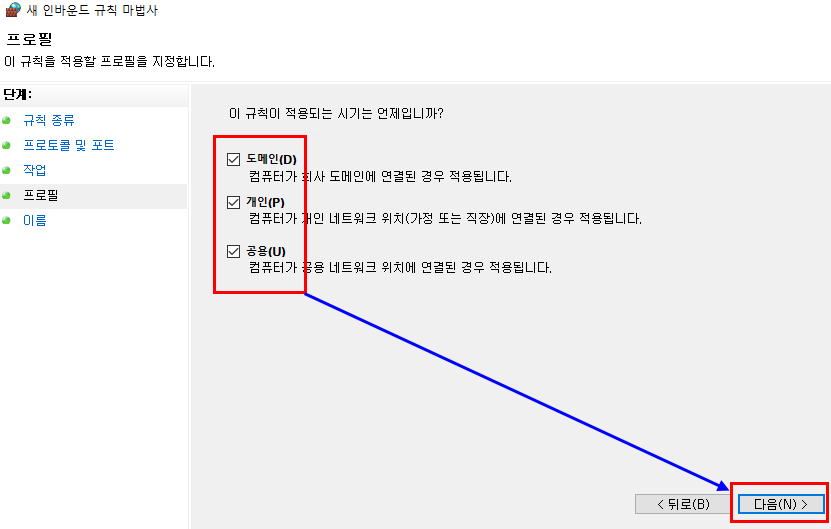방화벽_연결허용 7. 규칙 적용 시점 : 모두 체크 (그냥 두세요)