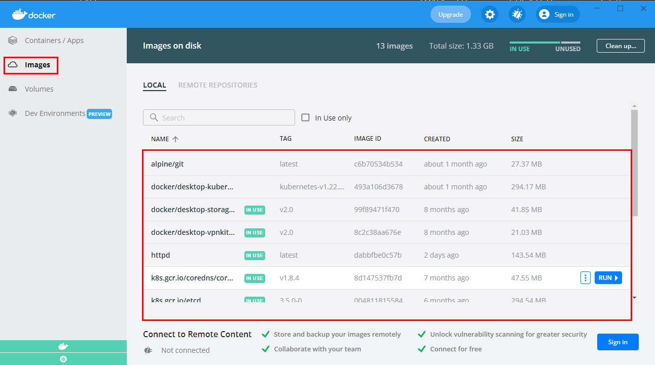 Docker Desktop 상태 및 Container 2. 좌측 메뉴의 이미지를 선택하며 현재 Pull 되어 있는 images 목록이 나타납니다.