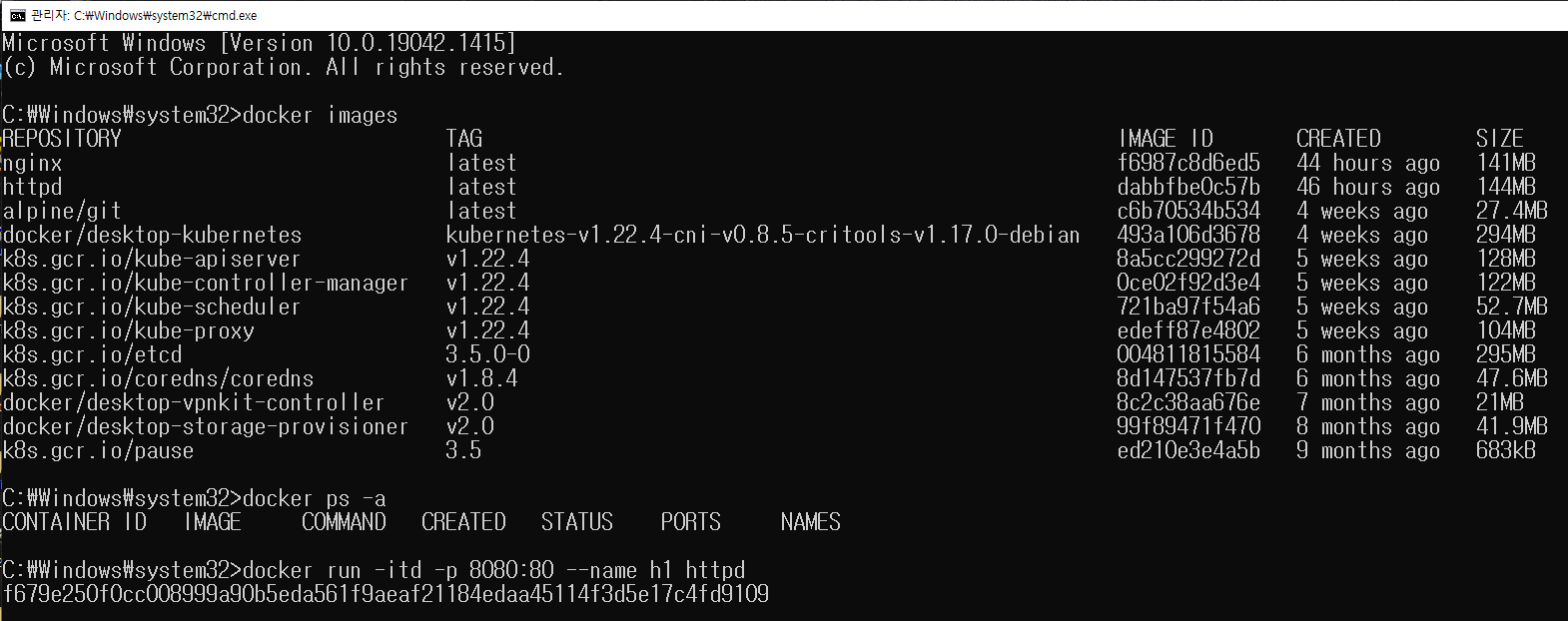 1. 제대로 설치하면 아래와 같이 Docker와 Kubernetes가 제대로 실행되고 있음을 알 수 있습니다.