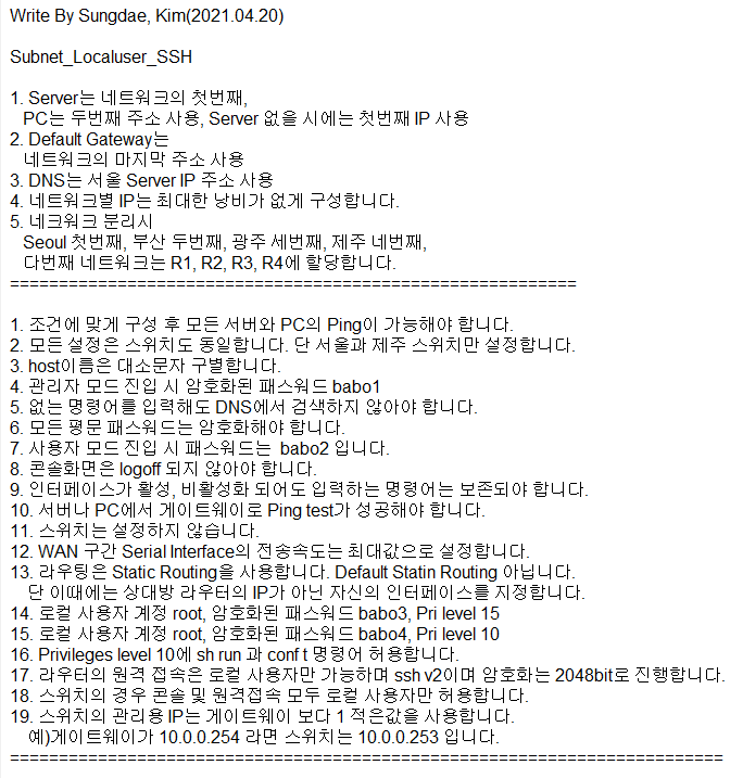 Packet Tracer : Subnet, Local User, SSH 설정 문제공부합시다!/Network 2021. 12. 24. 08:57728x9011_Subnet_USERSSHTELNET문제 (1).pka0.52MB