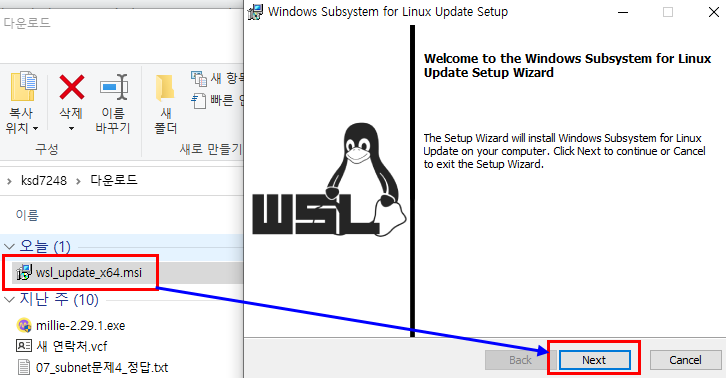 재부팅 3. WSL2 Linux 커널 업데이트 패키기를 다운로드 후 설치합니다.