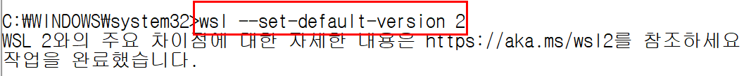cmd 실행 6. WSL의 기본 버젼을 2로 설정 합니다.