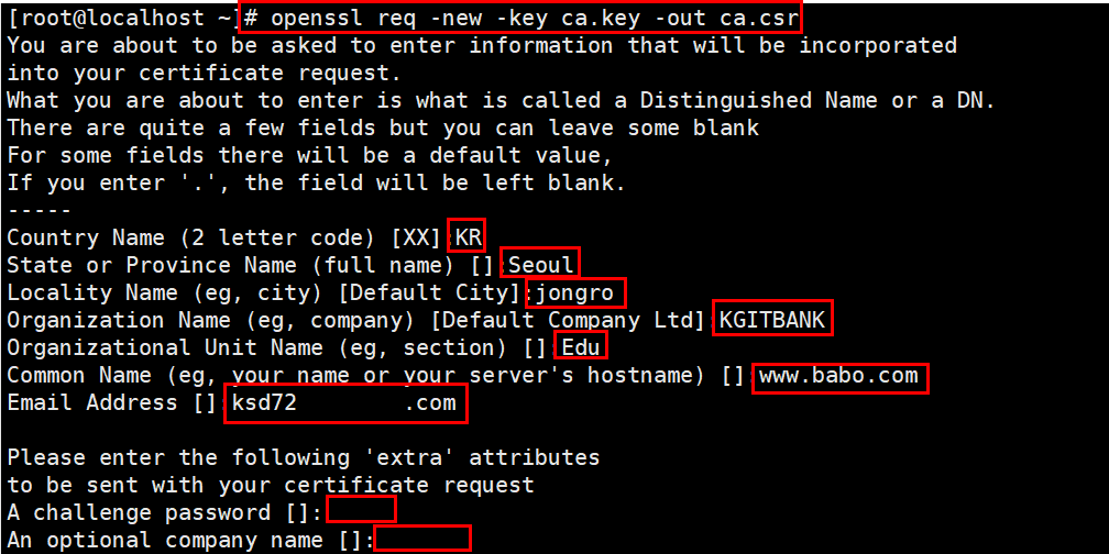 인증요청서 2.2. 국가코드, 도시, 지역, 조직이름, 조직부서 등을 기입해 줍니다. 조금 틀리셔도 사설인증서 만들기에는 충분합니다.
