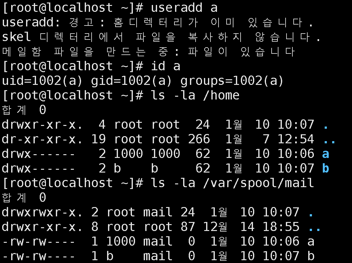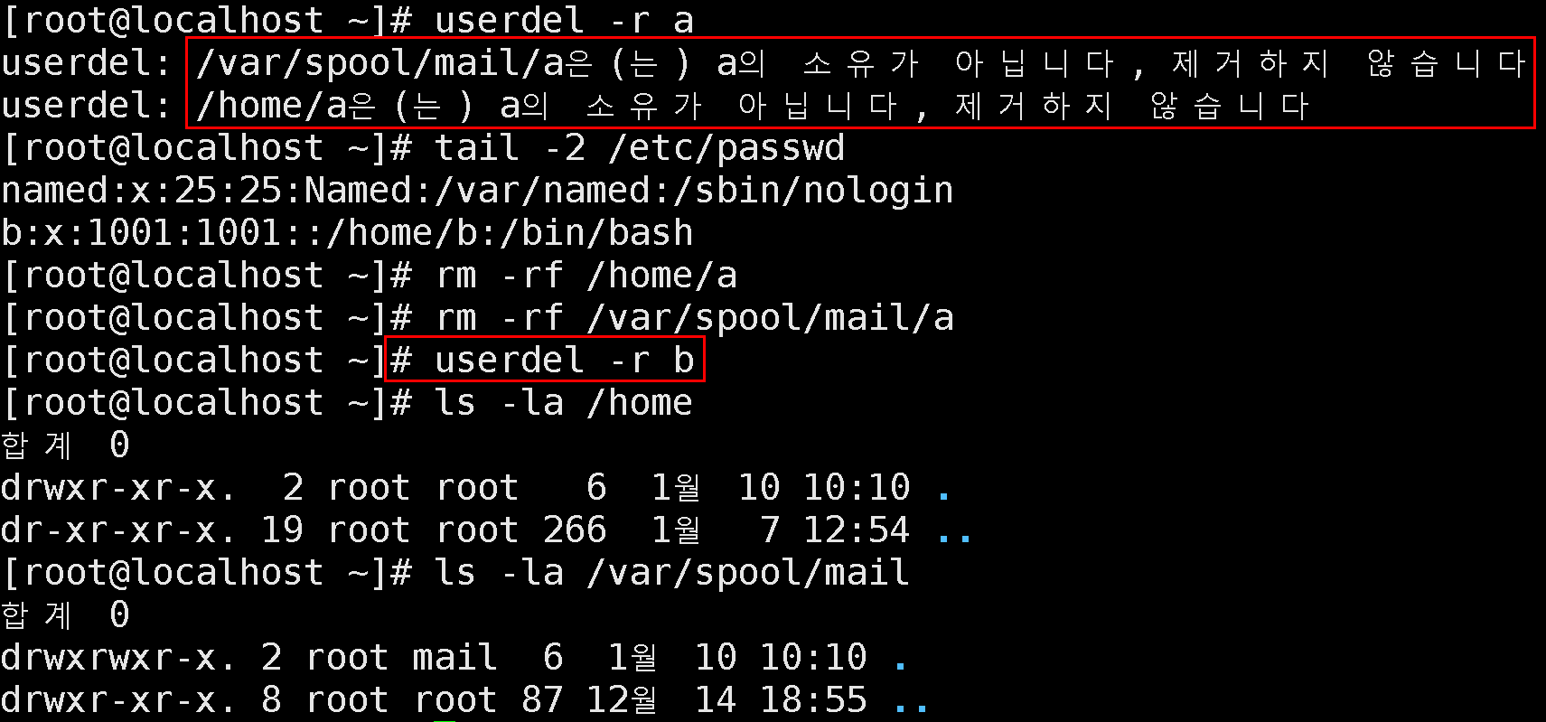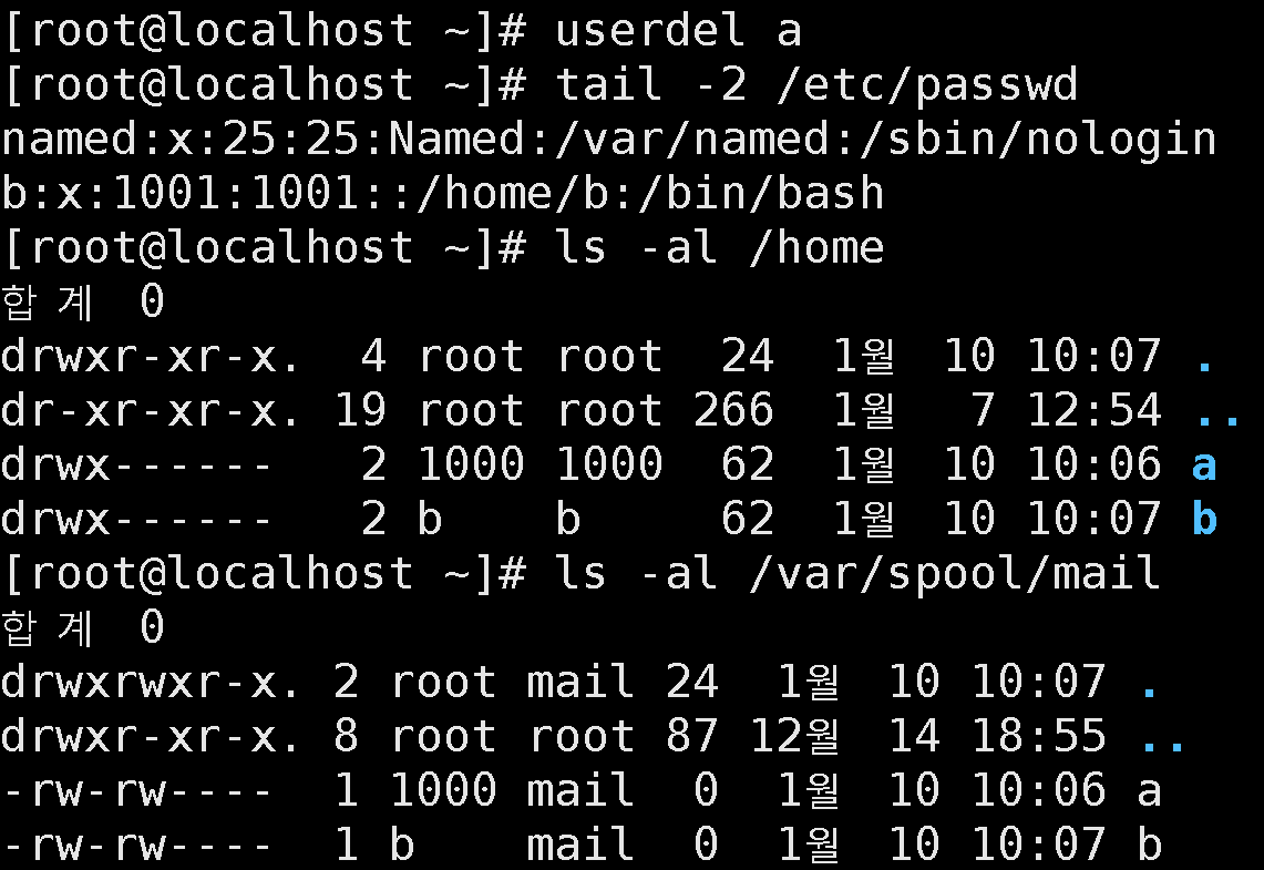 4.3. # rm -rf /home/a /var/spool/mail/a 수동으로 삭제합니다.
