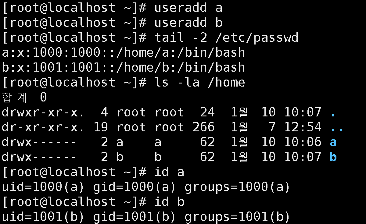 1.3. /home 디렉토리의 사용자 a,b 홈디렉토리 생성확인, 소유주및 그룹 유심히