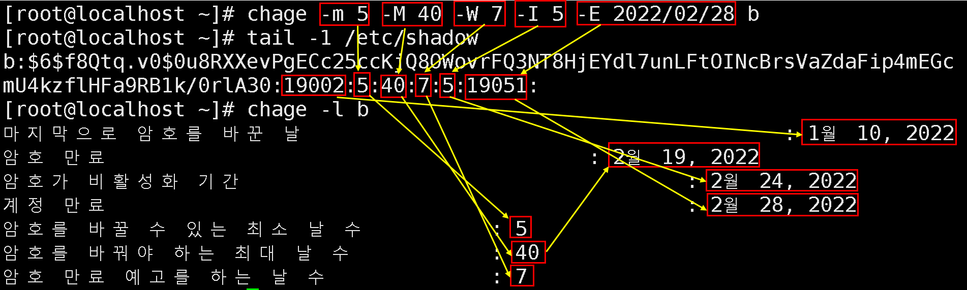 각 칼럼은 chage 명령어로 변경이 가능합니다.