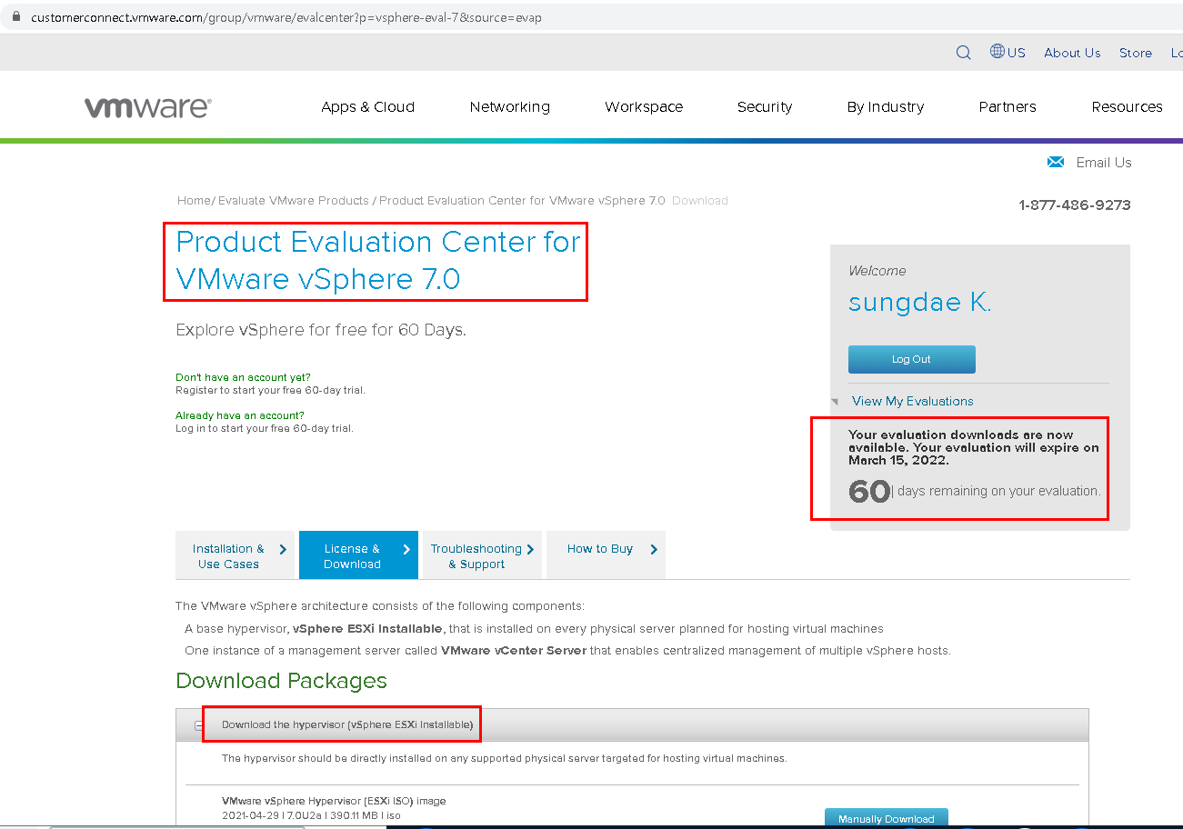 1.1. vmware의 공식 사이트에서 회원 가입 후 60일간 사용가능한 평가판 다운로드