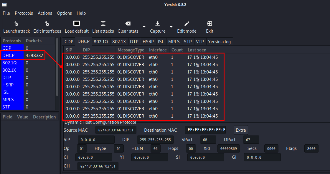 Launch attack ->DHCP -> Sending DISCOVER 선택 -> OK