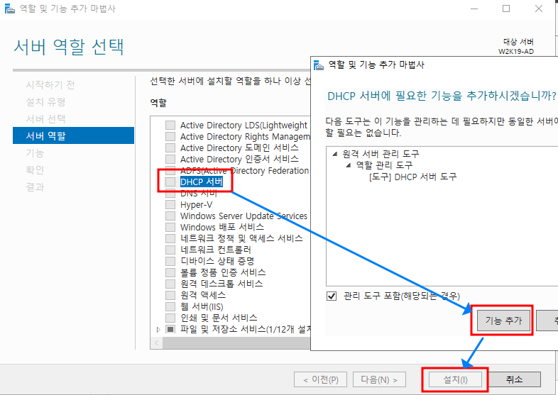 2.5. 서버 역할 -> DHCP서버 선택 -> 기능 추가 -> 다음