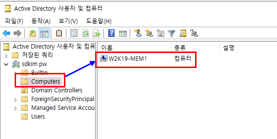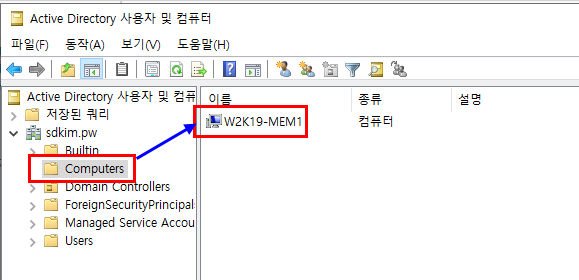 4.7.1. Active Directory 사용자 및 컴퓨터 -> Computers -> Member Server Hostname 확인