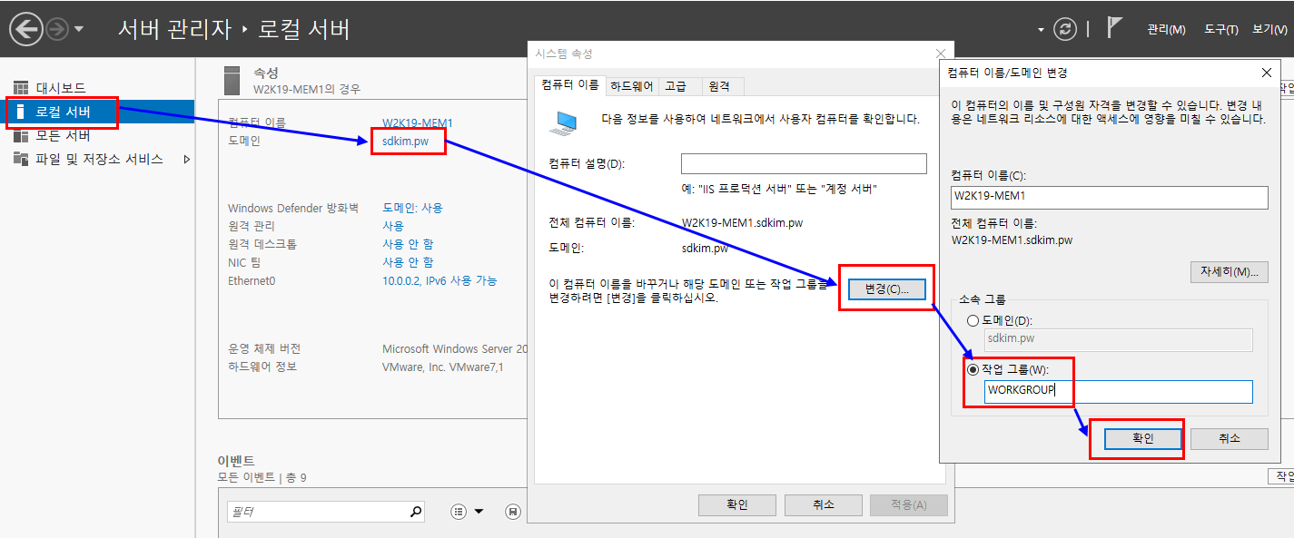 4.4.1. 로컬서버 -> 도메인 -> 변경 -> 작업그룹 -> WORKGROUP 입력 -> 확인