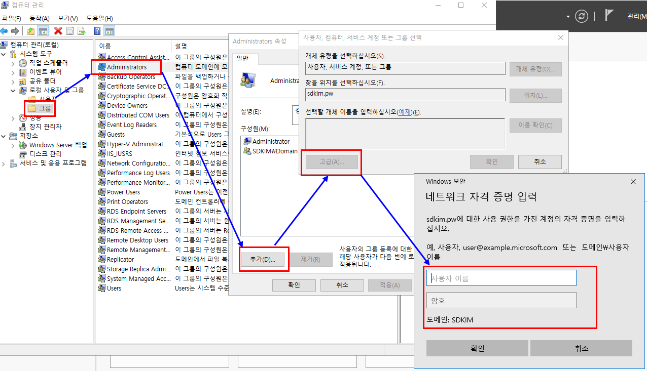 3.2.2. 컴퓨터관리 -> 그룹 -> Administrators -> 추가 -> 찾을 위치 : 도메인 -> 고급 클릭