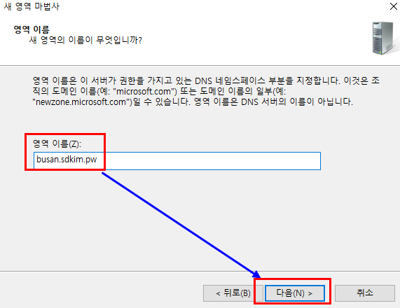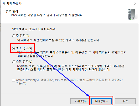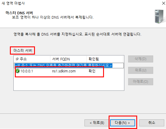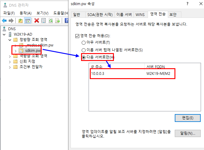 또한 이렇게 서로 다른 도메인으로 구성한 경우에는 상대방의 DNS 정보를 나의 DNS 보조 영역으로 구성하는 것이 원활한 통신을 보장하기 보조영역까지 구성하도록 합니다.