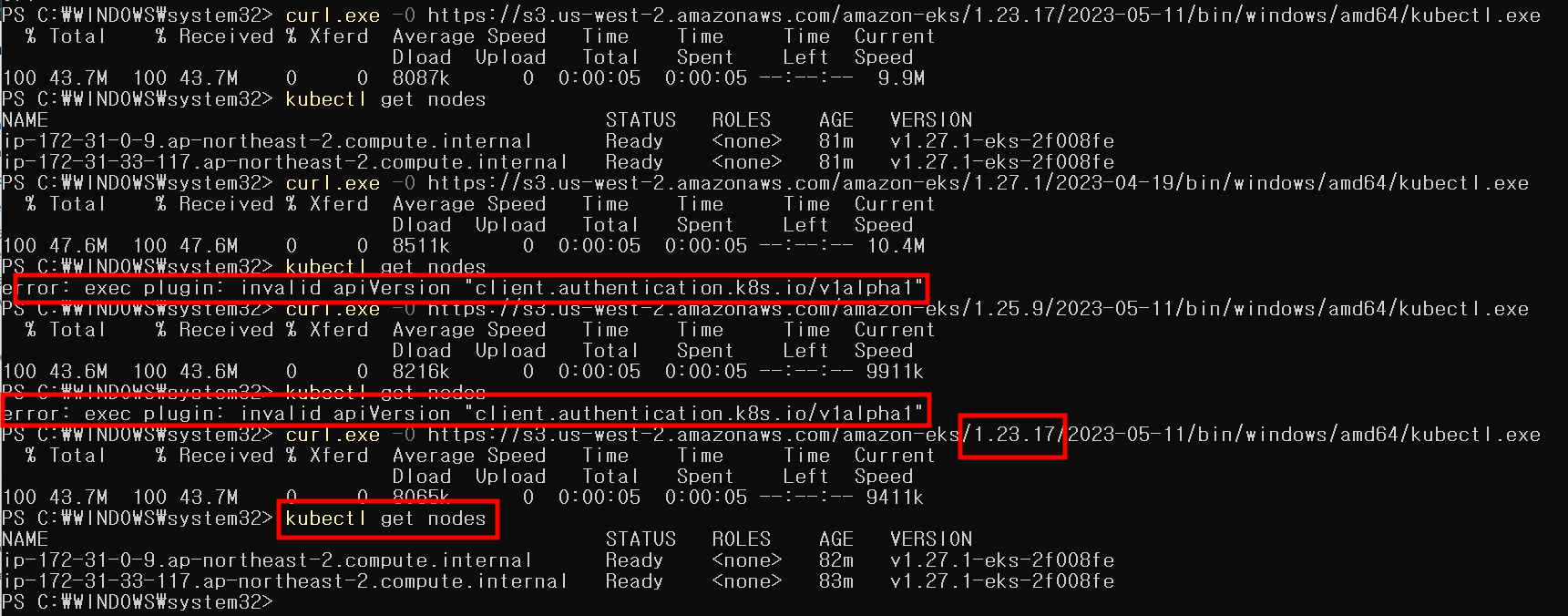 curl.exe -O https://s3.us-west-2.amazonaws.com/amazon-eks/1.23.17/2023-05-11/bin/windows/amd64/kubectl.exe