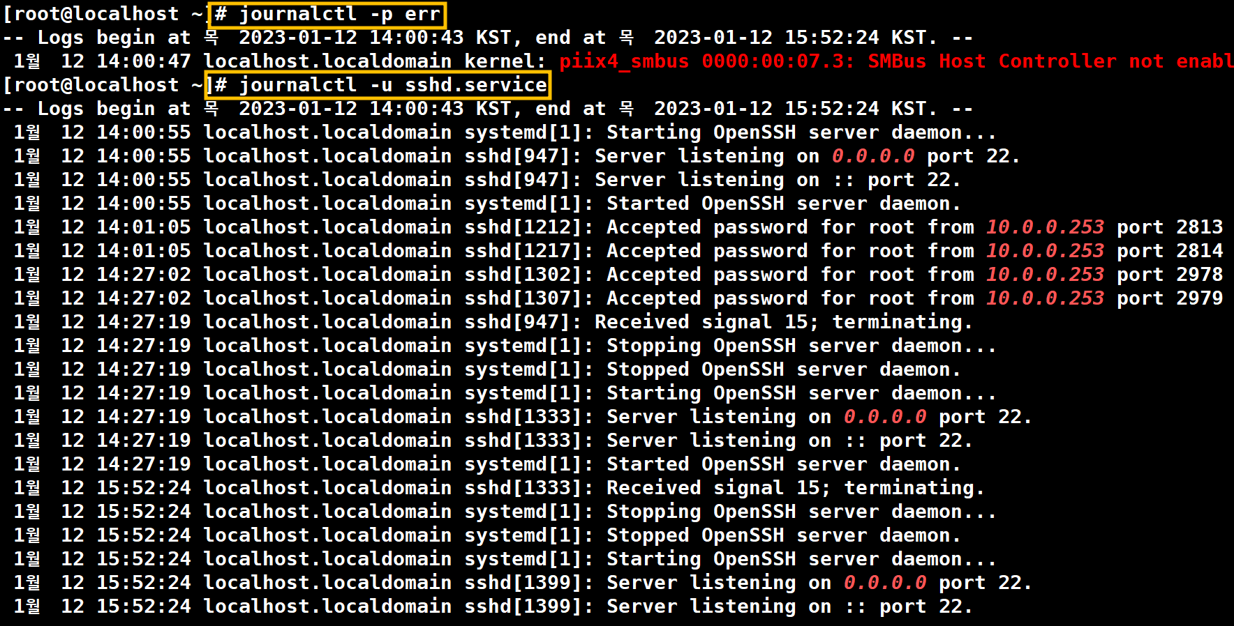 1.2.4. # journalctl -u sshd.service: 지정된 시스템 unit에 대한 Message 출력