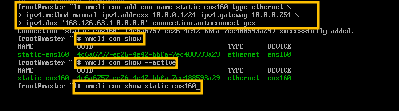 # nmcli con add con-name static-ens160 type ethernet ifname ens160