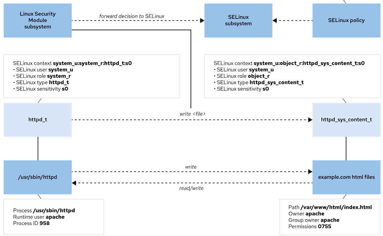 1.5.5. Apache 웹 서버 프로세스는 httpd_t 유형 컨텍스트로 실행,정책 규칙에서는 Apache 서버가 httpd_sys_content_t 유형 컨텍스트를 사용하여 레이블이 지정된 파일 및 디렉터리에 액세스하도록 허용.