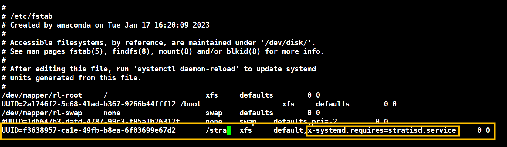 UUID=f3638957-ca1e-49fb-b8ea-6f03699e67d2 /stra xfs default,x-systemd.requires=stratisd.service 0 0