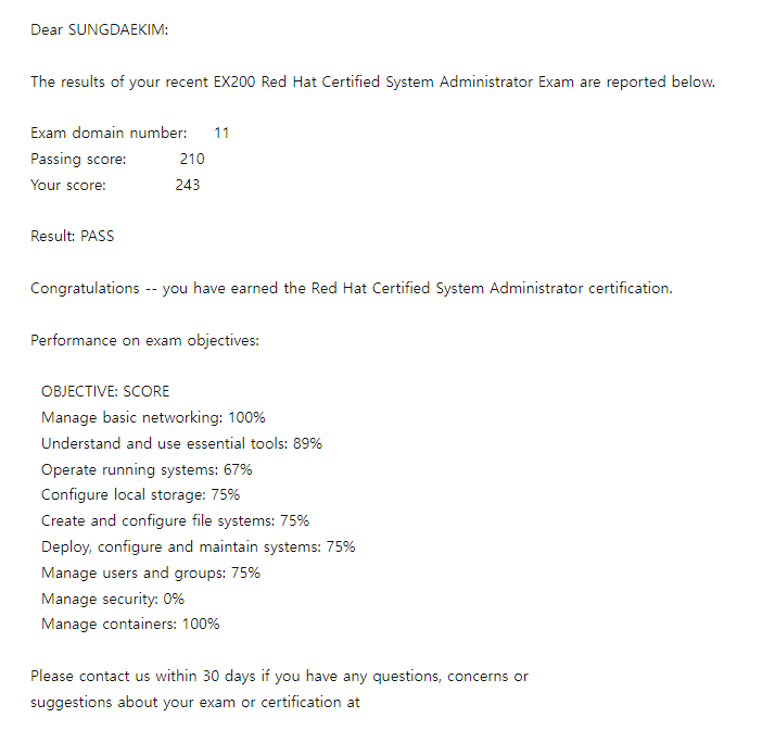 점수가 쪼매 낮지만 그래도 합격했으니 이제 RHCE 준비해야 겠네요!