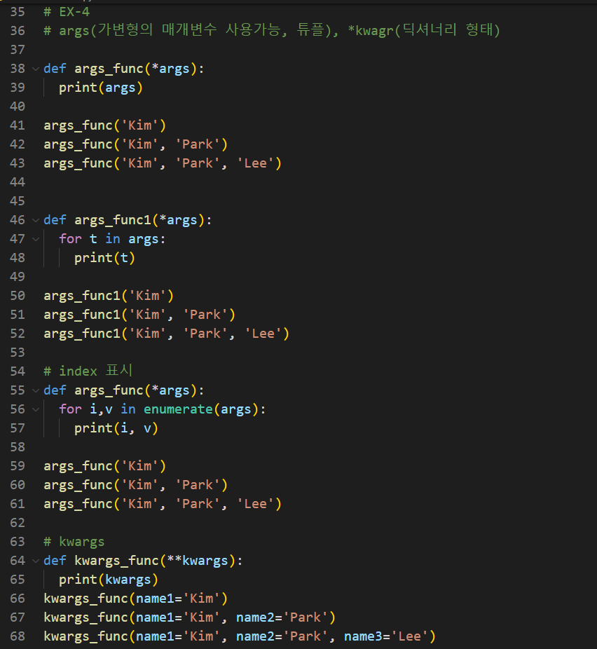 # args(가변형의 매개변수 사용가능, 튜플), *kwagr(딕셔너리 형태)