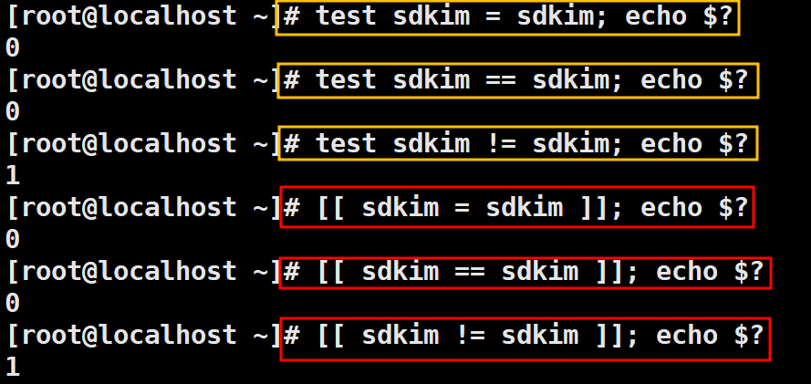 [root@localhost ~]# test sdkim == sdkim; echo $?