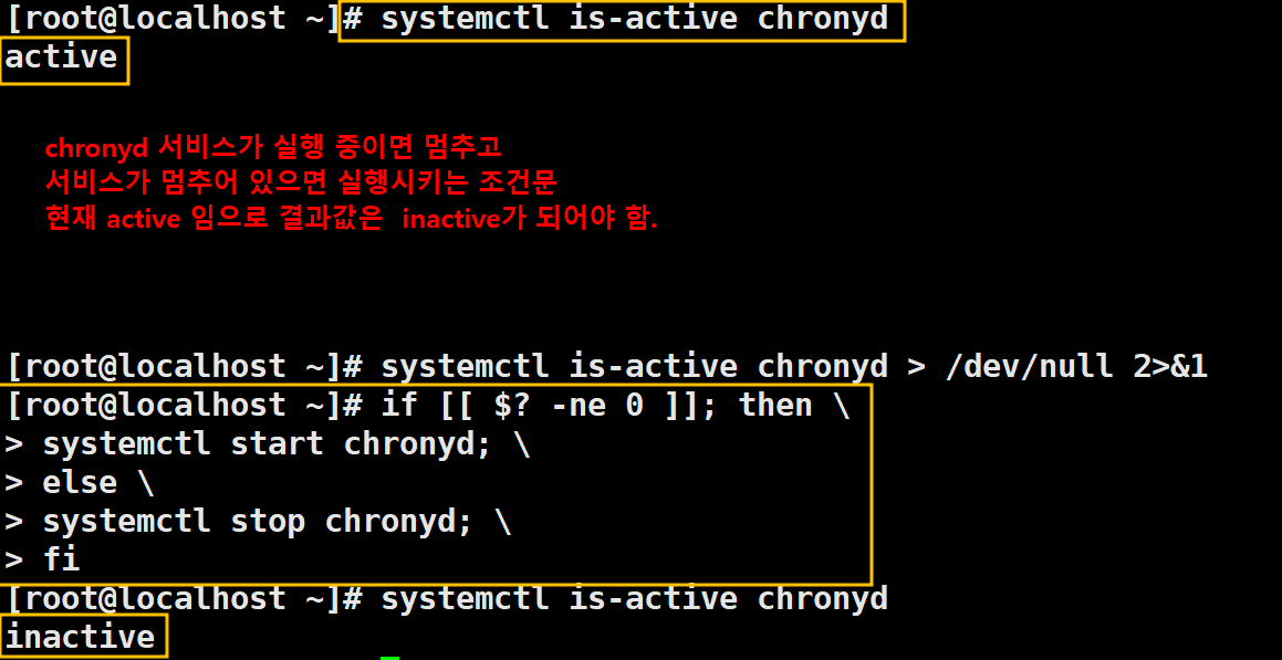 [root@localhost ~]# if [[ $? -ne 0 ]]; then systemctl start chronyd; fi