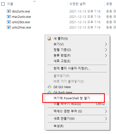 해당 폴더 진입 후 shift key + 마우스 우측 버튼을 클릭합니다.
