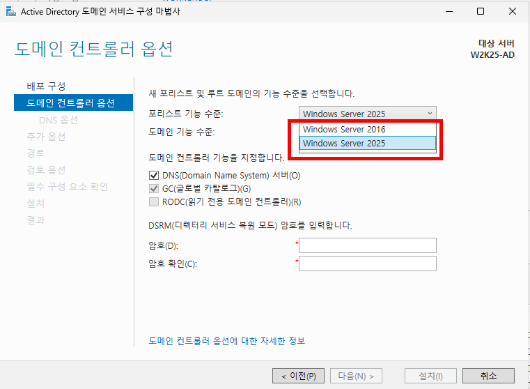 기존 2022에서는 포리스트 및 도메인 영역이 2016으로 설정되어 있었습니다.