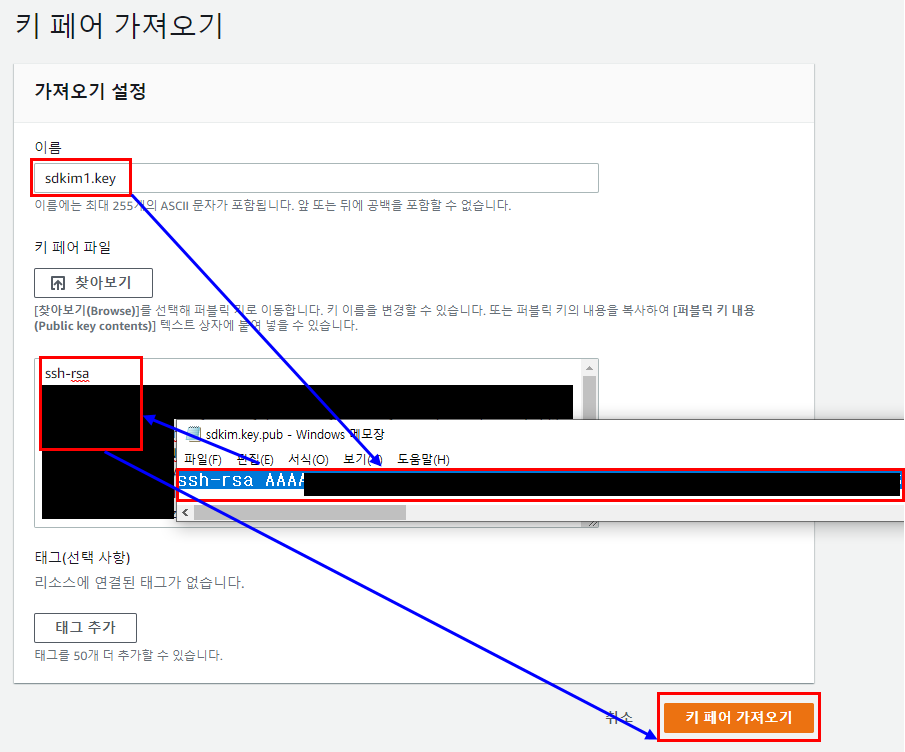 7. 생성한 key pair 중 public key 업로드